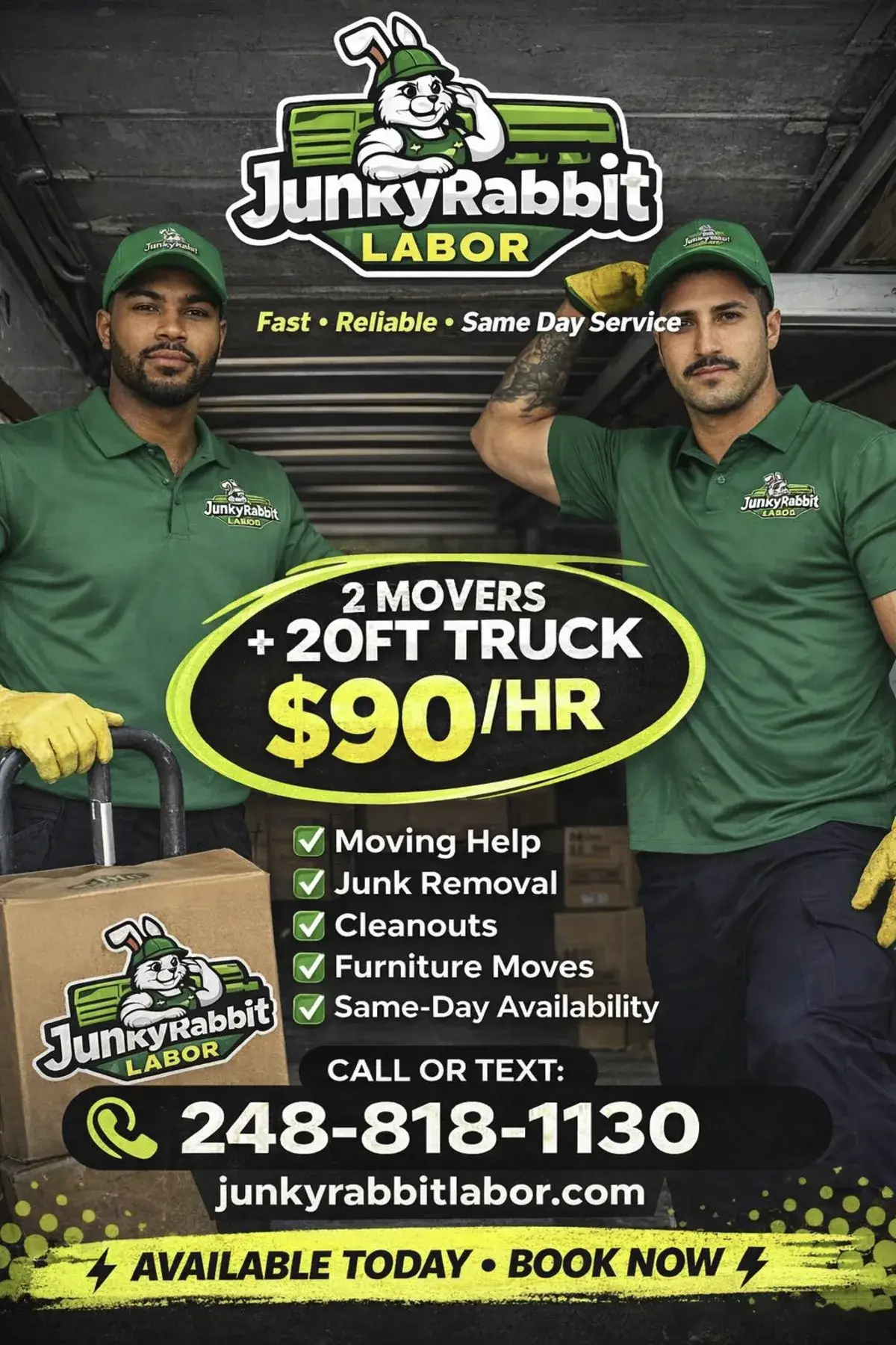 Junky Rabbit Labor serves the entire Detroit Metro area. We travel to your home, rental, or business. No trip fee for most locations.